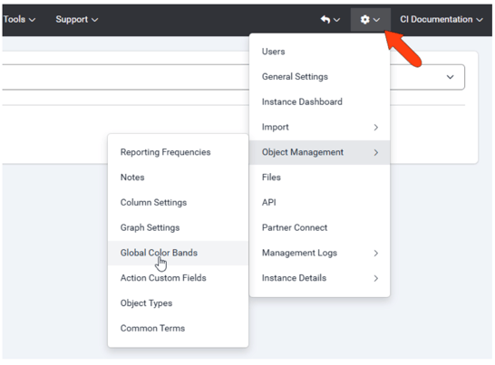 To configure default color bands and thresholds for each polarity type, click the Administration icon and choose Object Management / Global Color Bands.