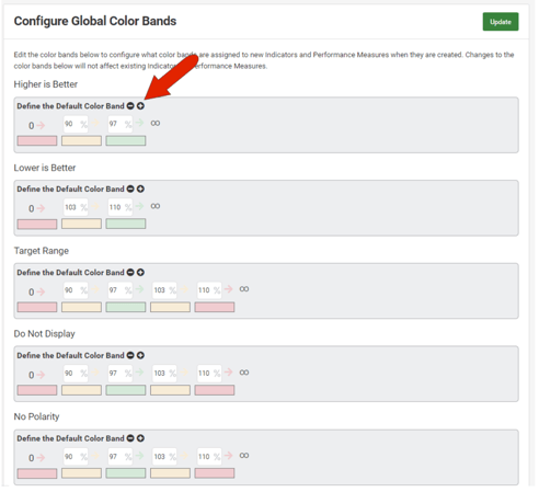 For each polarity type, you can adjust the percent-of-target values for each band, change band colors, and use the Add / Remove icons to add or remove bands. If you make any changes, be sure to click Update. Note that any global color changes will not affect existing graphs, only graphs for measures created after the changes are made.