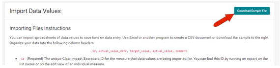 - id (required): The ID of the measure into which the values will be imported. This ID is the series of numbers at the end of the URL of the page when viewing a measure.