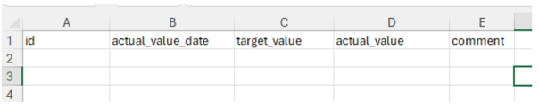 - target_value (optional), actual_value (required): Numerical values up to six decimals. Do not include symbols such as % or $. If the value is a percent, use the percent number, not the decimal. For example, 90% should be entered as 90.