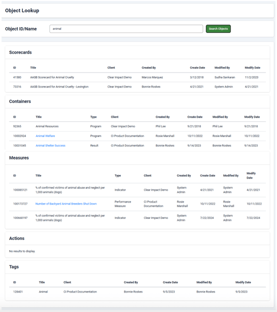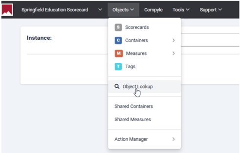 The Object Lookup feature enables you to search for scorecards, containers, measures, actions, and tags, by entering a keyword. The search will be performed across all instances to which you have access.