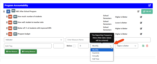 When adding a measure to a result or program, or creating a measure from scratch, one of the required fields is one of the fields is Reporting Frequency - how often data values are entered. By default, you can choose from Monthly, Quarterly, Annually, or Half Year.