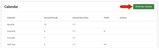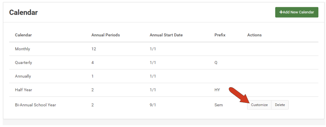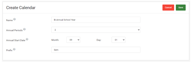 In this example, the “Bi-Annual School Year” calendar is for school semesters, so there are two periods each year. The Start date is September 1 each year, and the prefix for this frequency will be “Sem.”
