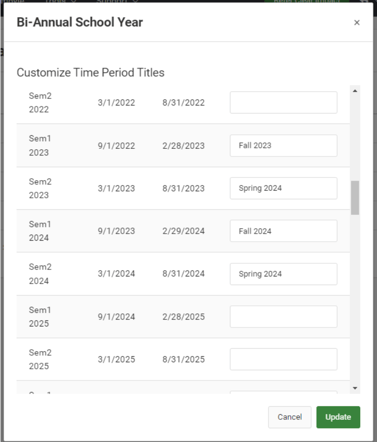 In this customization example, “Fall” and “Spring” labels are applied to two years’ worth of time periods. Click Update to save changes.