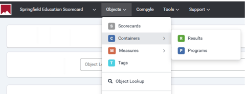 To view all results, programs or custom objects in your instance, choose Objects / Containers / Results or Programs. (If the admin user has created other container types, those will also appear on this menu.)