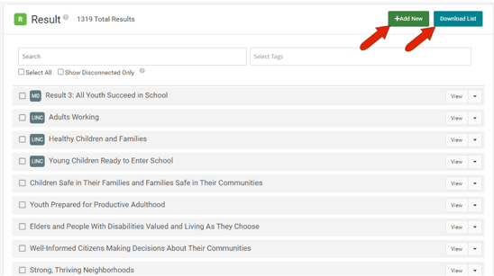 The Results list includes all results created in your instance. There are buttons at the top to download the list, or create a new result.
