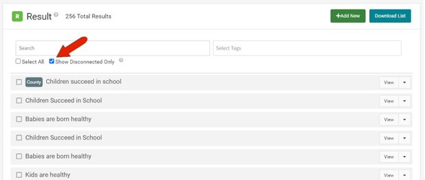 Checking the Show Disconnected Only box will display all results not used in any containers or scorecards. This feature is handy for cleaning out old or unneeded results.