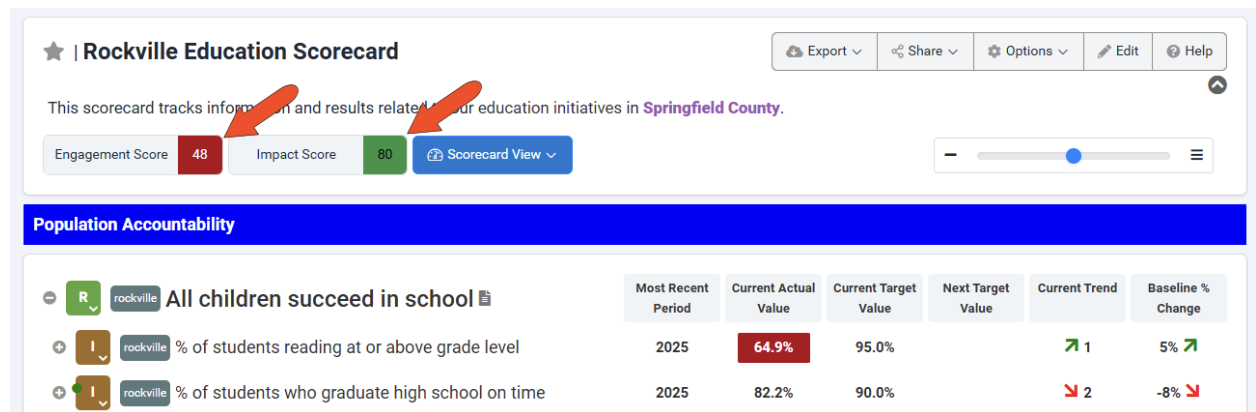 Both accountability scores, which can range from 1 to 100, are calculated based on our RBA (results-based accountability) algorithms, to provide insight into how effectively the scorecard is being used and how well it is performing.