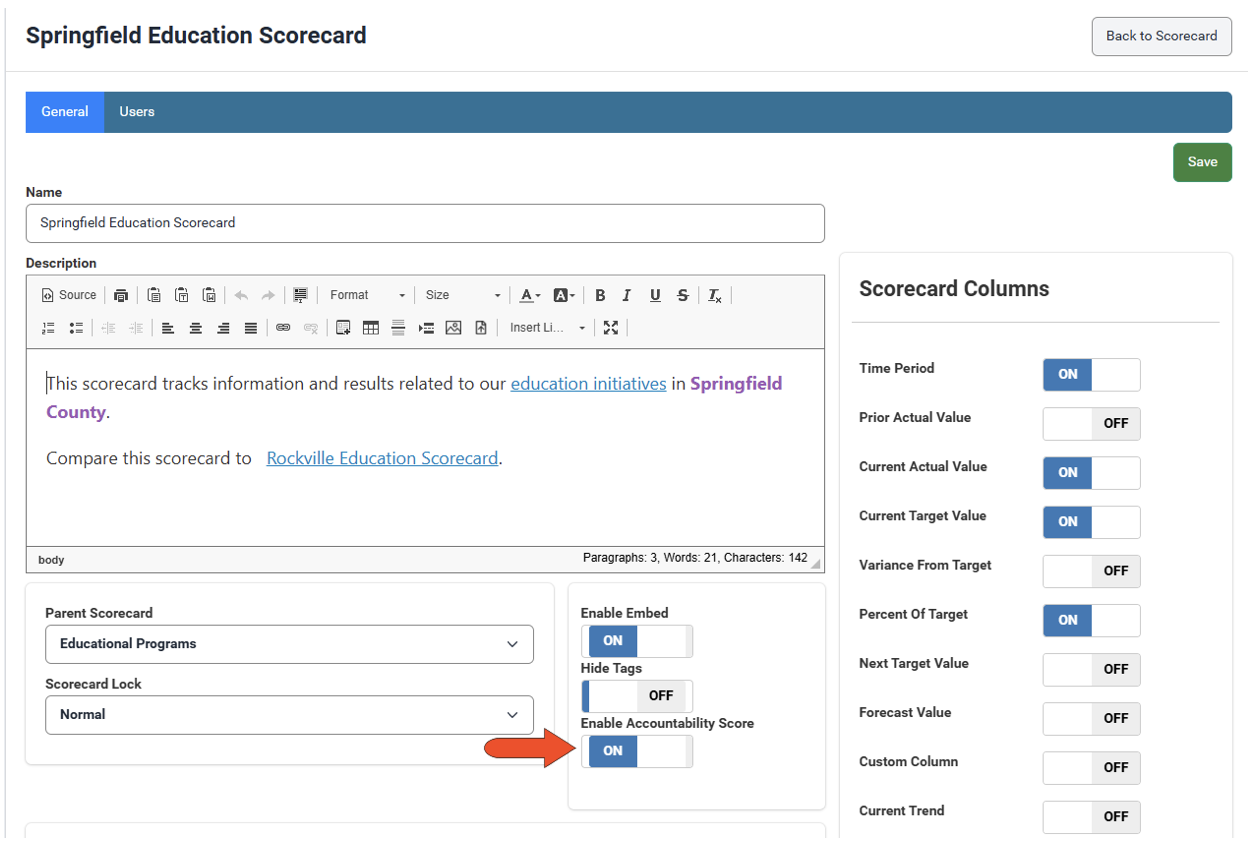 Accountability scores can be enabled or disabled when creating or editing the scorecard.