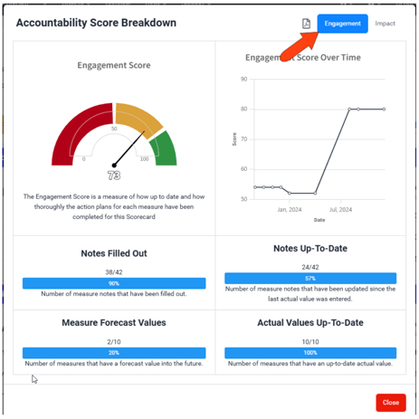When viewing a scorecard, the Engagement Score and Impact Score are listed at the top of the page.