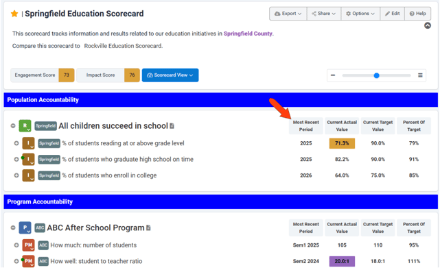When viewing a scorecard, scorecard columns appear along the right side of each container. These columns display current data for indicators and / or performance measures.