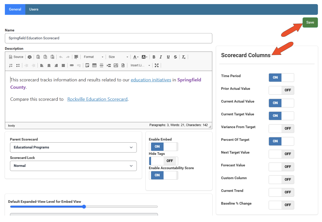 In the Scorecard Columns section, configure the columns you want displayed, and click Save.