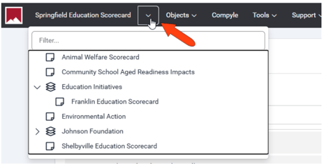 For a quick list of all scorecards in your instance, click the drop-down arrow next to the name of the current scorecard. Clicking a different scorecard will open that scorecard view.