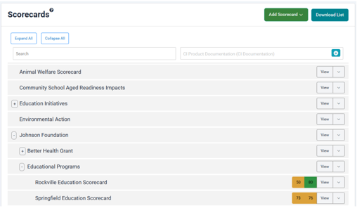 To the right of each scorecard are the engagement and impact scores, if enabled, and a View button to view the scorecard. (You can also view a scorecard by clicking its name.)
