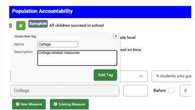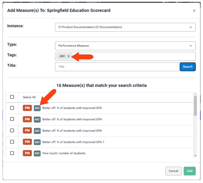 Tags enable you to filter the list of objects, making it easy to find the exact one you want. For example, when looking for an existing measure to add to a container, you can filter the list by entering one or more tags and clicking Search.