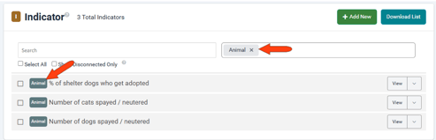 You can also use tags to filter object lists. For example, when searching the Indicators list, entering a tag filters the list to display only indicators assigned that tab.