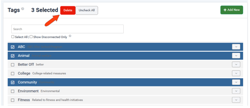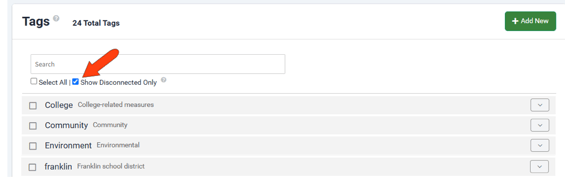 In the Tags list, checking the Show Disconnected Only box will filter the list to include only tags that are not assigned to any scorecard objects. This is handy if you want to clean out all unused tags from your system; select all disconnected tags and delete them all at once.