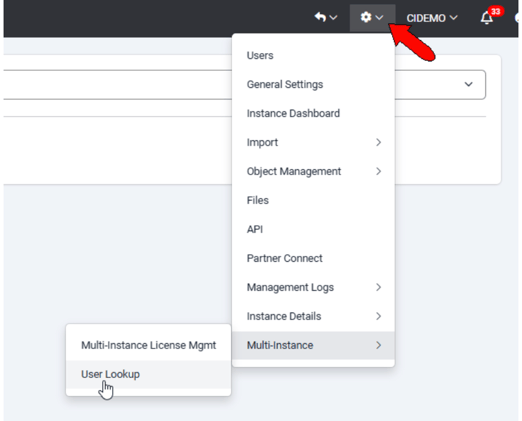 Admins of multiple instances are able to look up a user to see the instances to which they have access. Click the Administration icon and choose Multi-Instance / User Lookup.