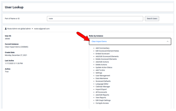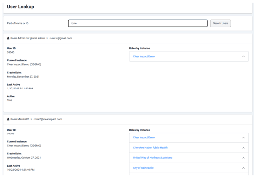 Enter any part of a user name, which will produce all users containing those characters. Each user is listed with their User ID, current instance, create date, and login details. Along the right are all instances to which the user has access.