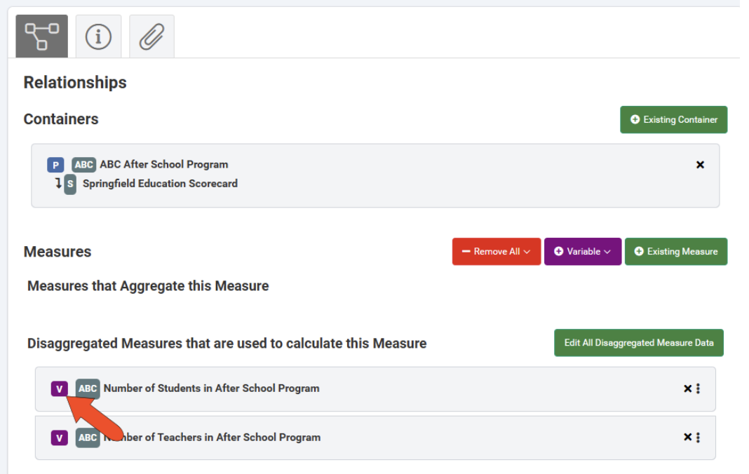 A variable is a no-cost alternative to an indicator or performance measure, designed to act only as a child (disaggregated) measure used in a calculated (aggregated) measure. Variables cannot be used as a stand-alone measure in a result or program container, and they contain only data - no notes, actions, or file attachments. Variables are created from scratch XREF, and do not count against the total number of measures in your account.