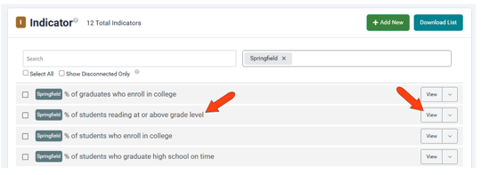 Or you can open the Indicators list or Performance Measures list, search for the measure you want to view, and click its name or View button. (If you have long lists of measures, or your lists include multiple measures with similar or identical names, tags enable you to filter your search.)