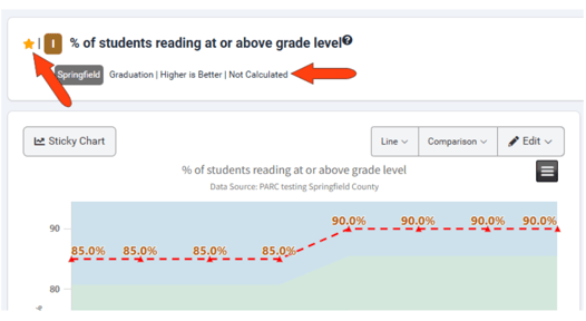 At the top left you can see the measure's reporting frequency, polarity, and whether the data is entered manually or calculated. If this is a measure you’ll want to access often, clicking the star icon to the left of the measure name will mark the measure as a favorite. Favorite measures, as well as favorite scorecards, are listed on your Dashboard.