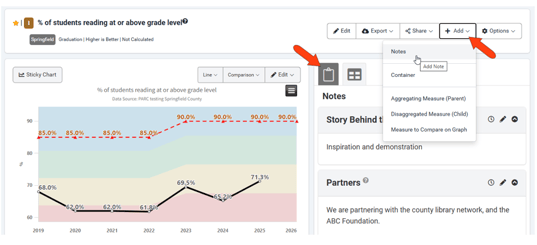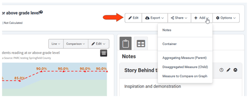 - Add: Options to Add Notes, add the measure to a container, add an aggregated or disaggregated measure, or add a comparison measure
