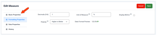 - Edit: Options to edit the measure’s basic properties, formatting or data properties, and view measure history