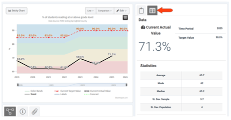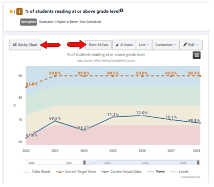 For measures that have data entered, the data graph appears below the measure name. Above the graph are several graph options; the options that appear depend on data type and number of data points: