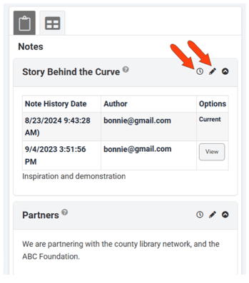 To complete, edit, or delete a note, click its Edit icon. Clicking a note’s History icon displays a chronological list of note additions and edits.