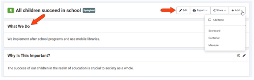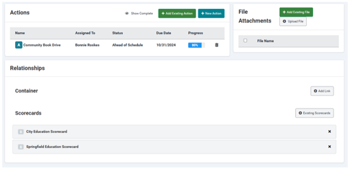 Below measures, you can add or edit Actions, upload File Attachments, and view and edit Relationships (containers and scorecards that use the result or program).