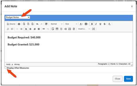 To add a note to the result other than the default notes already included, use the Add / Add Note option shown above. In the Add Note window, choose one of the standard note types in your system. You can fill in the note now or later, and opt to move the notes section below where measures are displayed. When finished, click Save.