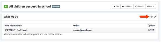To complete, edit, or delete a note, click its Edit icon. Clicking a note’s History icon displays a chronological list of note additions and edits.
