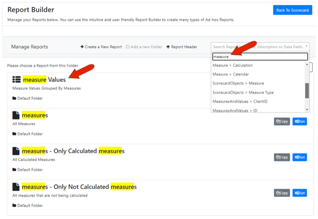The search field can be used to find a report by keyword. For example, the keyword “measure” produces a list of all reports along the left that have “measure” in the title or description. The drop-down search list itself contains all report fields, in which the term “measure” appears in either the report name or report field.
