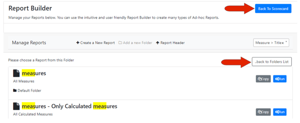 From any reports list or folder, you can return to the folders level by clicking Back to Folders List. There is also a Back to Scorecard button at the top right.