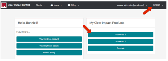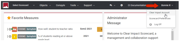 If you are working in Scorecard, you can access Control by clicking your user name and choosing Clear Impact Account.