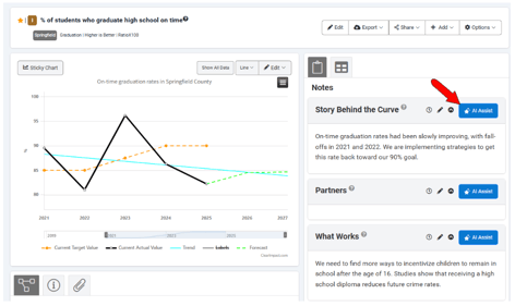 Scorecard has an option called AI Assist, which can be enabled by an admin user. AI Assist does a couple of things: data trend identification and interpretation, and AI-generated notes.