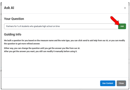 Clicking this button opens the Ask AI popup, with a default prompt in the Your Question field. You can edit this prompt to tailor the answer, or leave it as us, then click Ask to generate an answer.