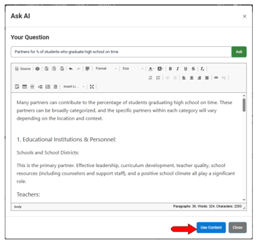 Once the answer is generated, edit and / or format as needed, and click Use Content. To start over with a new AI-generated answer, simply revise the prompt and click Add again.
