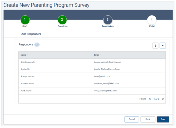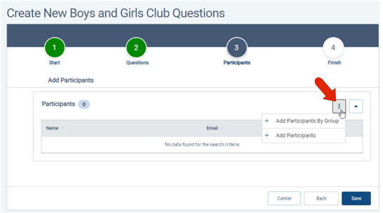 After a survey is created and contains questions, Step 3 is to add participants. The participants you add in this step will be included in each survey instance by default, but you can edit a survey, or any survey instance, to change its participants.