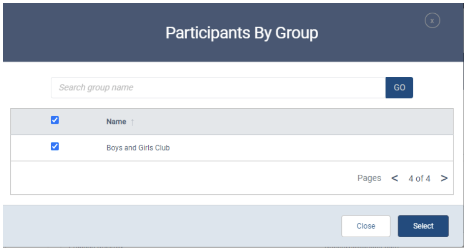 If adding by participant / organization group, simply choose one or more groups and click Select. All participants / organizations in the selected groups will be added.