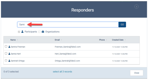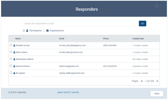If adding by participants, your entire Participants or Organizations list will be available for selection. Organizations will appear at the top of the list, followed by participants.