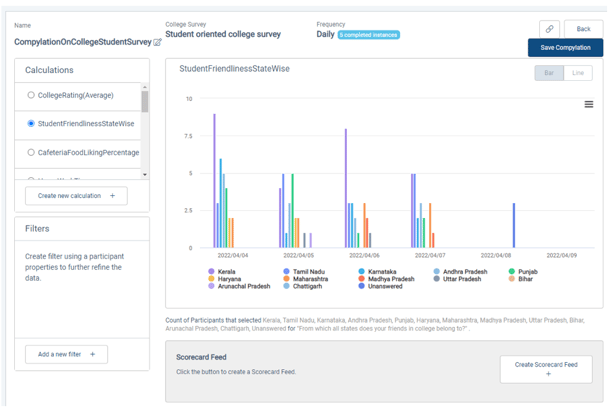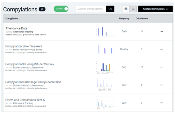 A set of analytics in Compyle is called a compylation, which pulls in each survey answer from each participant from closed survey instances, and presents the aggregate data in meaningful ways in the form of calculations.