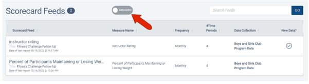 The archived scorecard feed no longer appears in the Scorecard Feeds list. But archived feeds can be seen by switching the Active slider to Archived.