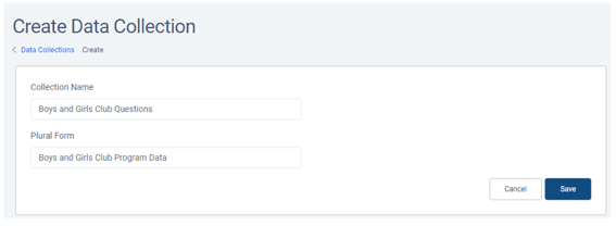 For Collection Name, enter the default name of a survey / data tool in this collection. This name can be changed for each survey you create and send out. Plural Form is the name of the overall collection. Click Save.