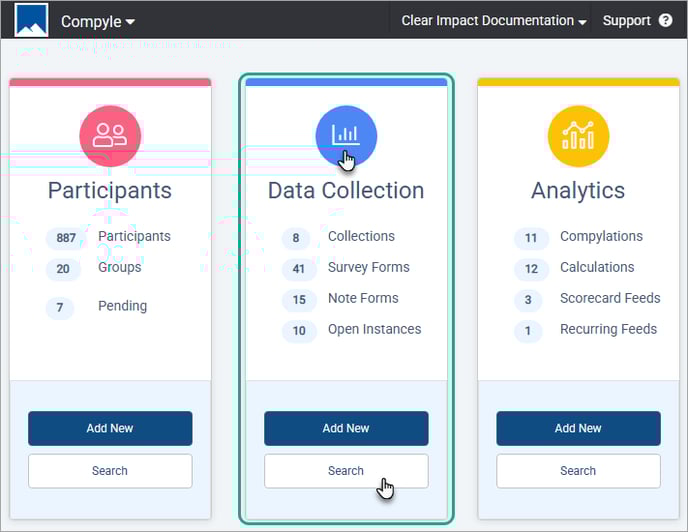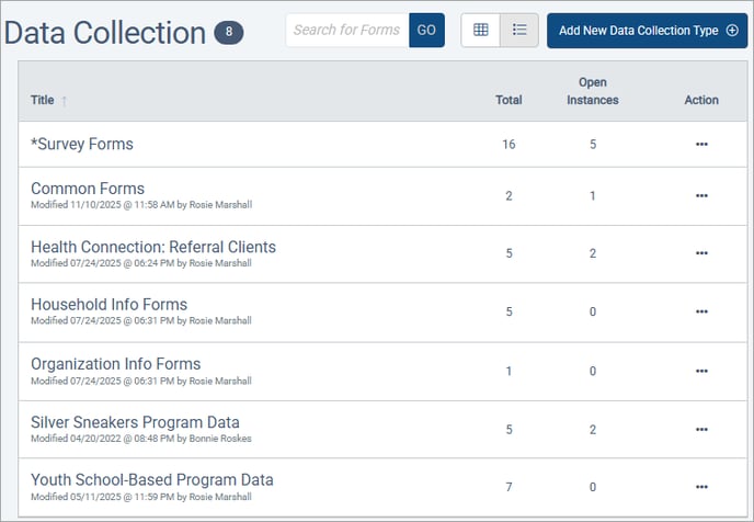 To create a survey, start by opening your list of data collections, or survey form categories.