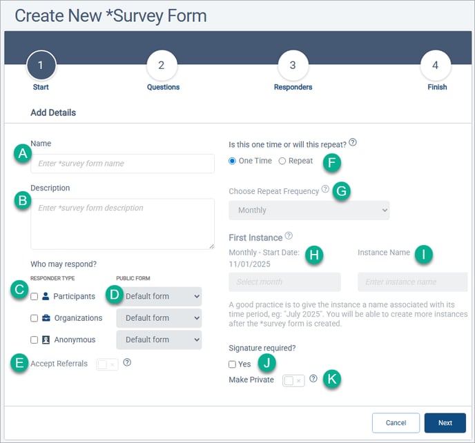 - F. Select whether this survey will be repeated or only used once. It's more common for survey forms to be repeated whether or not the same people are filling out the survey each time.