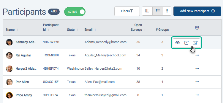 In the active search results, the ... three-dot menu will appear for each participant or organization. Hovering your mouse over this menu will display three of these options: View, Archive or Delete, and Edit.