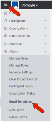 Compyle provides several standard email templates, which can be accessed by opening Admin from the sidebar and choosing Email Templates.
