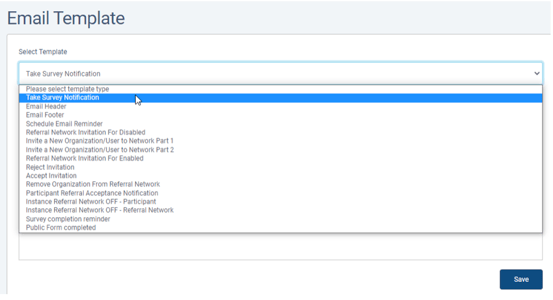 Email types include Take Survey Notification, Schedule Email Reminder, Survey Completion Reminder, etc.